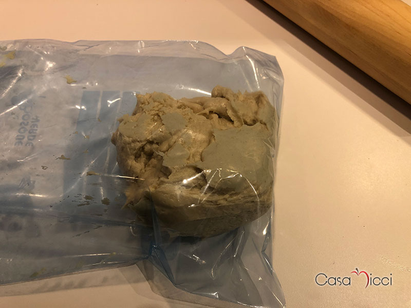 Disponi l'impasto su carta forno, coprilo con pellicola trasparente e riponilo in frigo per un'ora.