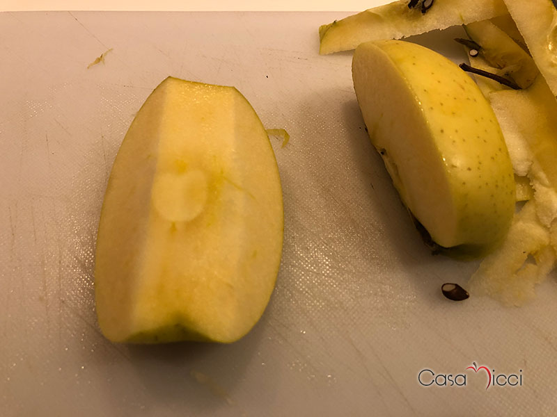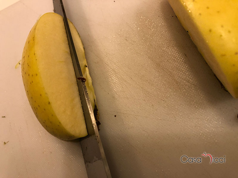 Prepara il ripieno. Taglia le mele golden in 4 e con un coltello a 45 gradi...