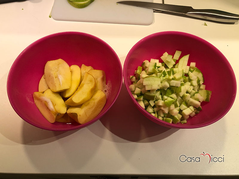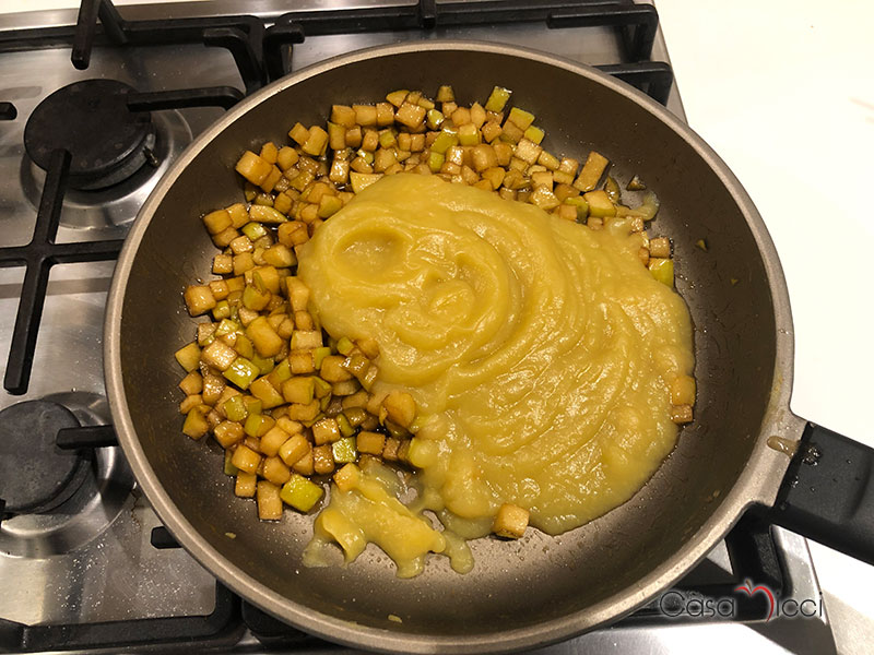 Metti le mele golden in un contenitore e cuoci al microonde finché non diventano morbide. Frulla tutto e metti in pentolino sul fuoco per addensare (a sinistra nella foto). In un'altra padella, metti le mele a cubetti sul fuoco con il burro e lo zucchero (a destra nella foto).