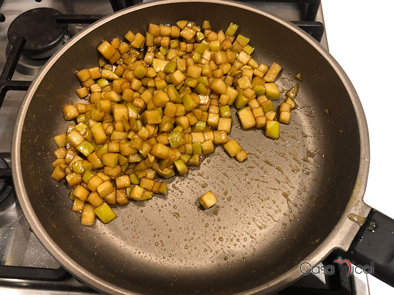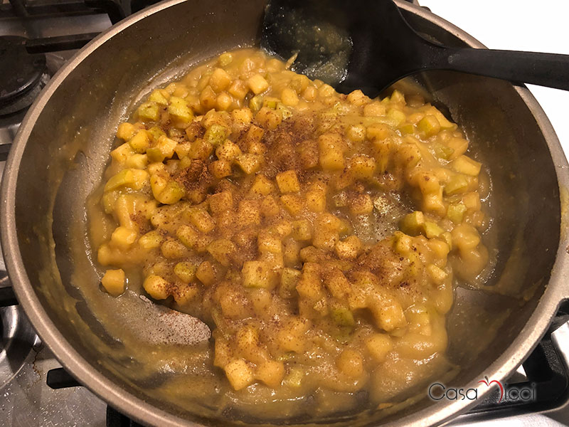 I cubetti di mela tenderanno a rilasciare un po' di succo, fai cuocere una decina di minuti in modo da far evaporare il liquido. Lo zucchero inizierà quindi a caramellare.