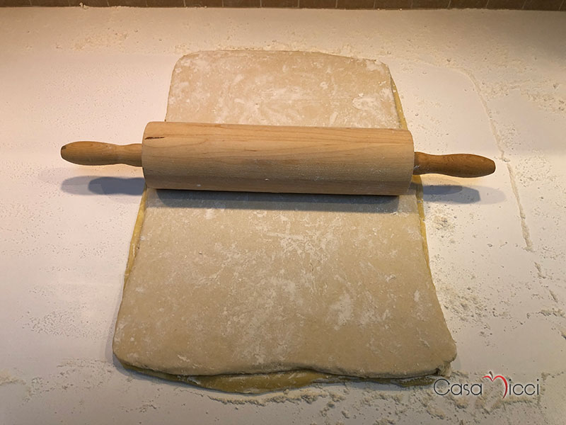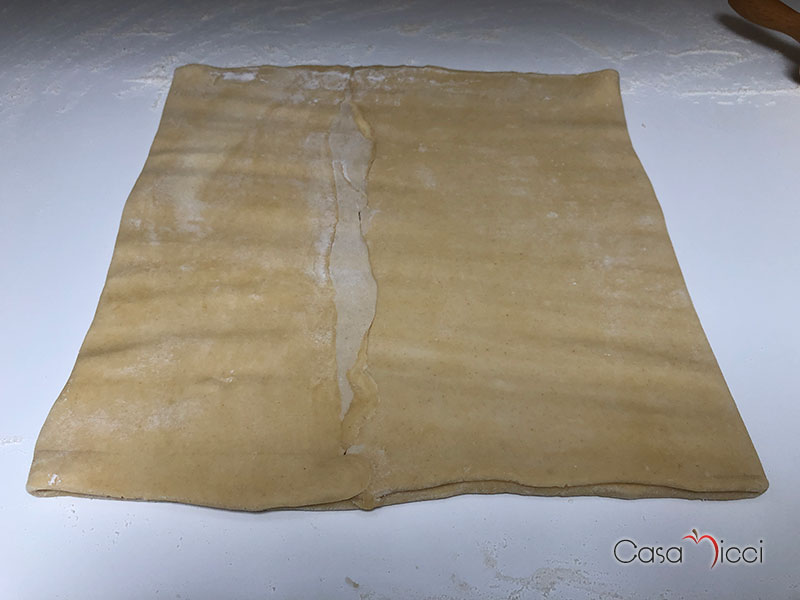 ...poi l'altro. Premi leggermente il matterello sull'impasto per sigillare le pieghe.