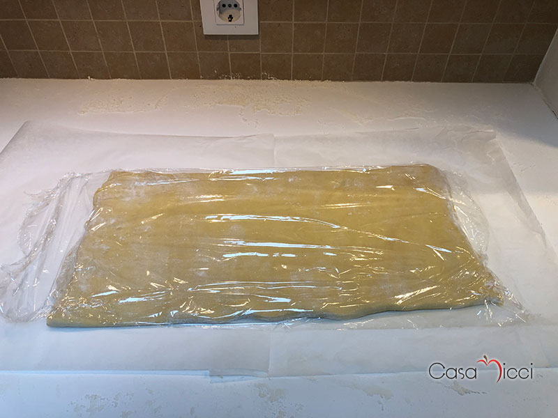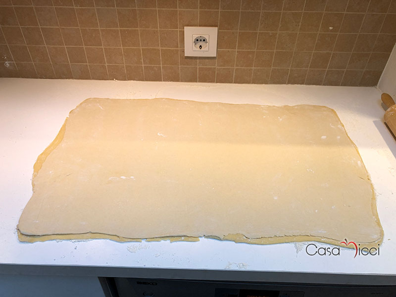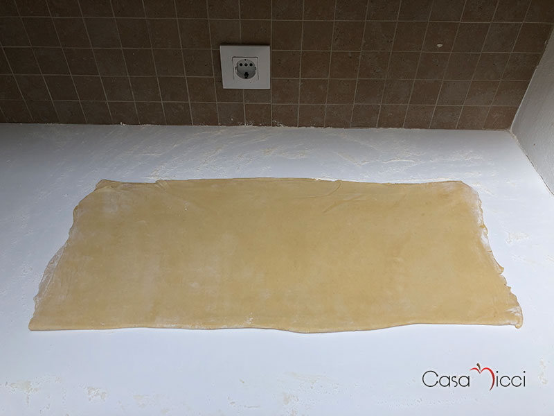 Trascorso il periodo di riposo, stendi nuovamente l'impasto, questa volta un po' più lungo di prima.