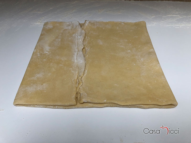 Le pieghe ora saranno diverse, sarà una piega a 4. Piega il primo lembo per un pò più della metà dell'impasto...